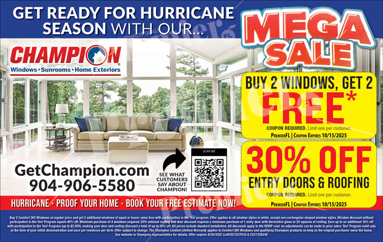 Champion Windows has been a leading name in home exteriors for decades, offering high-performance windows, doors, sunrooms, and roofing solutions. Serving Jacksonville and the surrounding area, their team is dedicated to helping homeowners improve comfort, safety, and energy efficiency year-round.