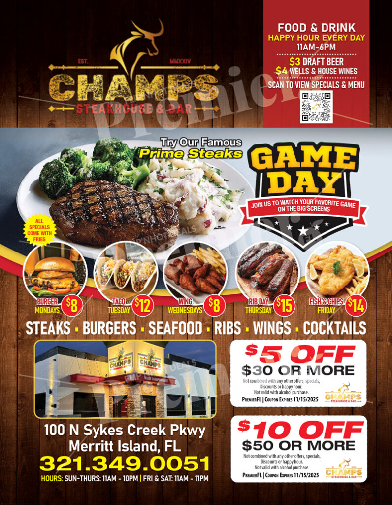 Champs Steakhouse & Bar is Merritt Island’s go-to destination for delicious steaks, fresh seafood,