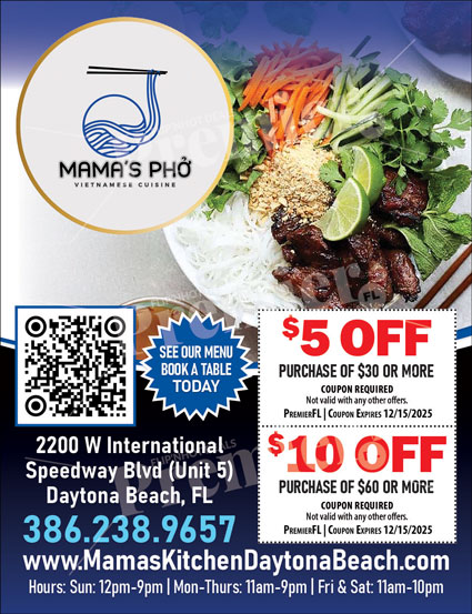 Mama’s Phở is a welcoming Vietnamese restaurant in Daytona Beach, Florida, serving traditional dishes rooted in authentic flavors and fresh ingredients. Known for its comforting atmosphere and carefully prepared meals, Mama’s Phở is a favorite for locals and visitors craving genuine Vietnamese cuisine made with care.