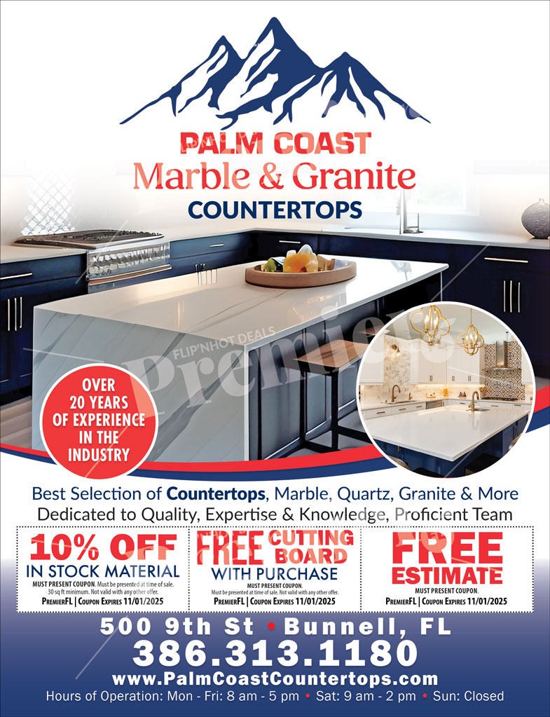 From consultation to installation, Palm Coast Marble & Granite provides personalized service and guaranteed satisfaction on every project. Visit their Bunnell showroom to explore premium materials and exclusive savings.