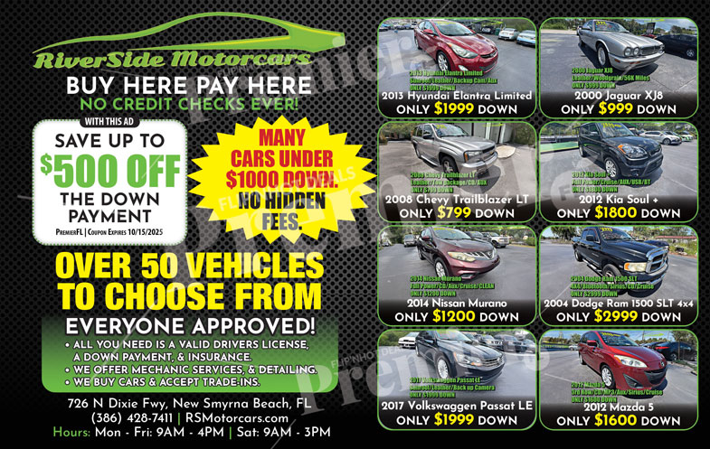 Get behind the wheel fast at Riverside Motorcars in New Smyrna Beach — your local “Buy Here, Pay Here” dealership where everyone is approved! With honest deals, flexible financing, and a wide variety of quality pre-owned cars, it’s never been easier to find your next ride.